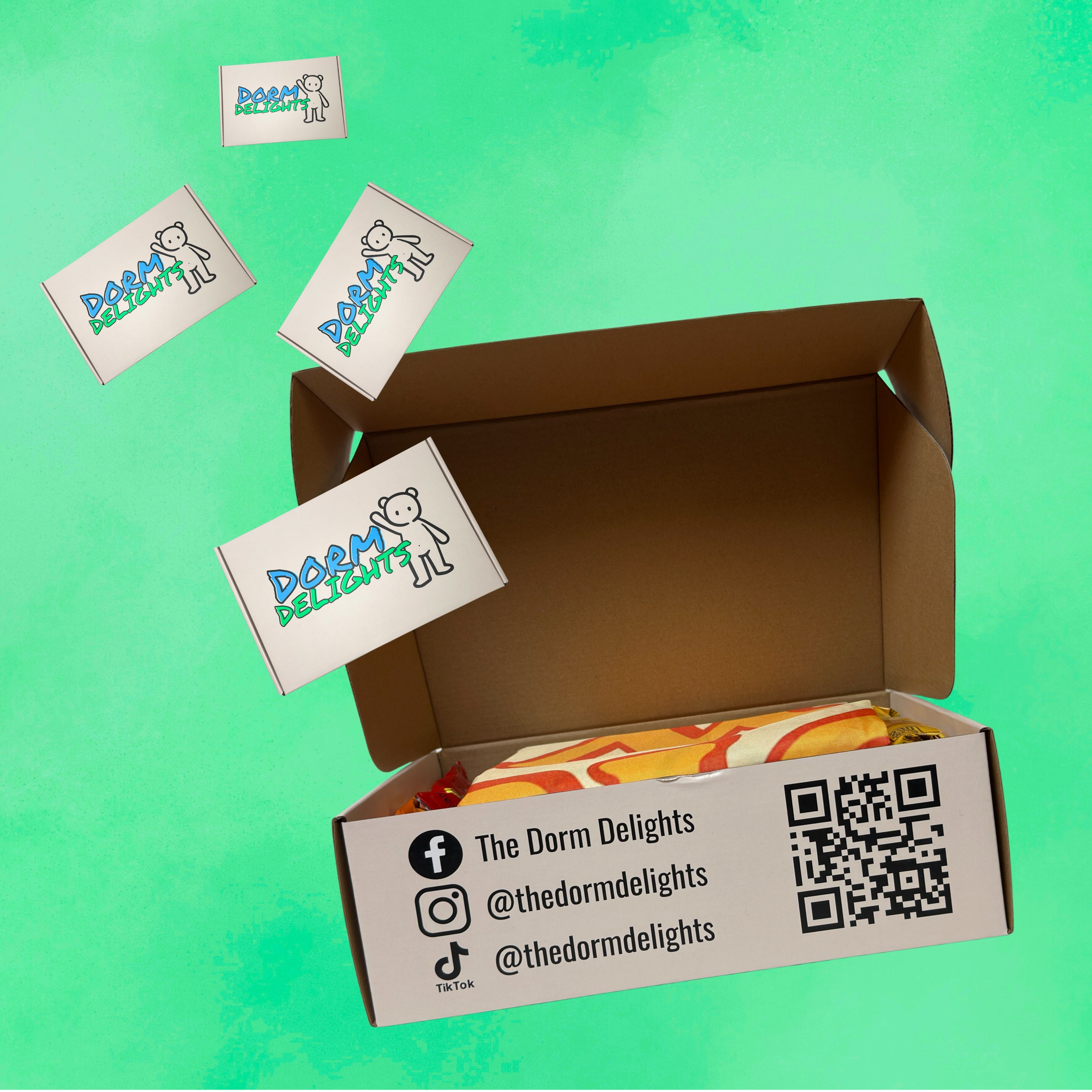 Each Dorm Delights box is carefully assembled with a variety of items; some items to expect are your customized postcard, seasonal items, stickers, jibbitz, promos, coupons, snacks, a drink, and so much more.